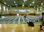 広い体育館。体育館の椅子並べと当時に我々はセッティングを開始。